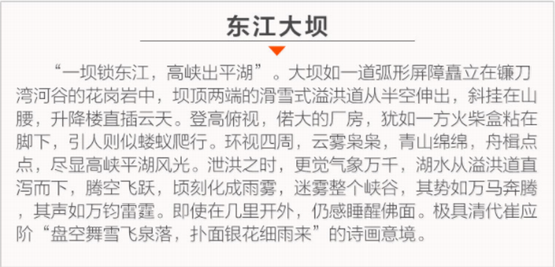 上午接團(tuán)后前往國(guó)家5A級(jí)旅游景區(qū),國(guó)家濕地公園----東江湖。進(jìn)入景區(qū)后車觀中華奇觀霧漫小東江,是由于東江大壩梯級(jí)開(kāi)發(fā)形成的景點(diǎn)。小東江水質(zhì)清澈明凈各項(xiàng)指標(biāo)均達(dá)到了國(guó)家一級(jí)飲用水標(biāo)準(zhǔn)。每年4—10月,每當(dāng)旭日東升或夕陽(yáng)西下,整個(gè)小東江云蒸霞蔚,朦朧縹紗,仿佛進(jìn)入仙境。然后前往亞洲壩——東江大壩旅游碼頭。東江湖景區(qū)面積200平方公里,160平方公里的湖面煙波浩淼,平均水深51米,最深處達(dá)157米,因?yàn)樗w較深,所以蓄水量相當(dāng)大。達(dá)81.2億立方米的湖水晶瑩透澈,相當(dāng)?shù)挠诎雮€(gè)洞庭湖,因此被譽(yù)為“湘南洞庭”,數(shù)十個(gè)島嶼星羅其中,被稱為“東方瑞士”。到達(dá)東江大壩旅游碼頭后前往龍景峽谷景區(qū)。龍景峽谷位于東江大壩右側(cè),峽谷內(nèi)有堪稱南國(guó)大的瀑布群--龍景十八瀑;是國(guó)內(nèi)大的天然氧吧!沿途山勢(shì)陡峭,青山滴翠,古木參天,清潭、瀑布成群,是我國(guó)目前瀑布密集高的景區(qū),有大小瀑布26處,水潭18個(gè),是國(guó)內(nèi)罕見(jiàn)的高負(fù)離子區(qū)。龍呤瀑、鴛鴦瀑、東江大壩等景點(diǎn),中午自行在東江大壩用中餐。