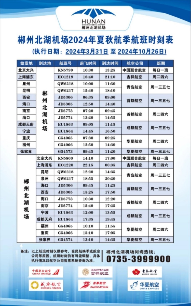 郴州旅游郴州北湖機(jī)場新增航線及2024年夏季航班時(shí)間表
