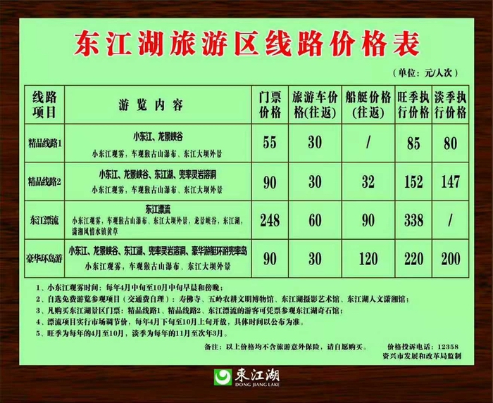 東江湖景區(qū)現(xiàn)行門(mén)票價(jià)格表,目前東江湖景區(qū)門(mén)票按旺季價(jià)執(zhí)行,精品線路一門(mén)票合計(jì)執(zhí)行價(jià)為85元,精品線路二門(mén)票合計(jì)執(zhí)行價(jià)為152元,東江湖漂流門(mén)票合計(jì)執(zhí)行價(jià)為338元,豪華環(huán)島游門(mén)票合計(jì)執(zhí)行價(jià)為220元。 |
