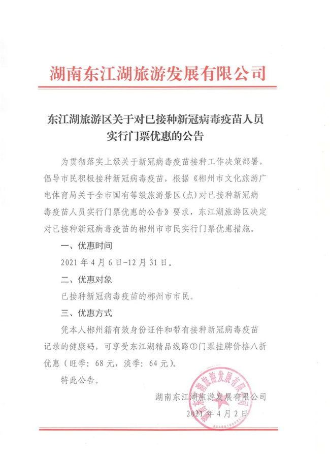 憑本人郴州籍有效身份證件和帶有接種新冠病毒疫苗記錄的健康碼,可享受東江湖精品線路①門票掛牌價格八折優(yōu)惠旺季:68元,淡季:64元)。