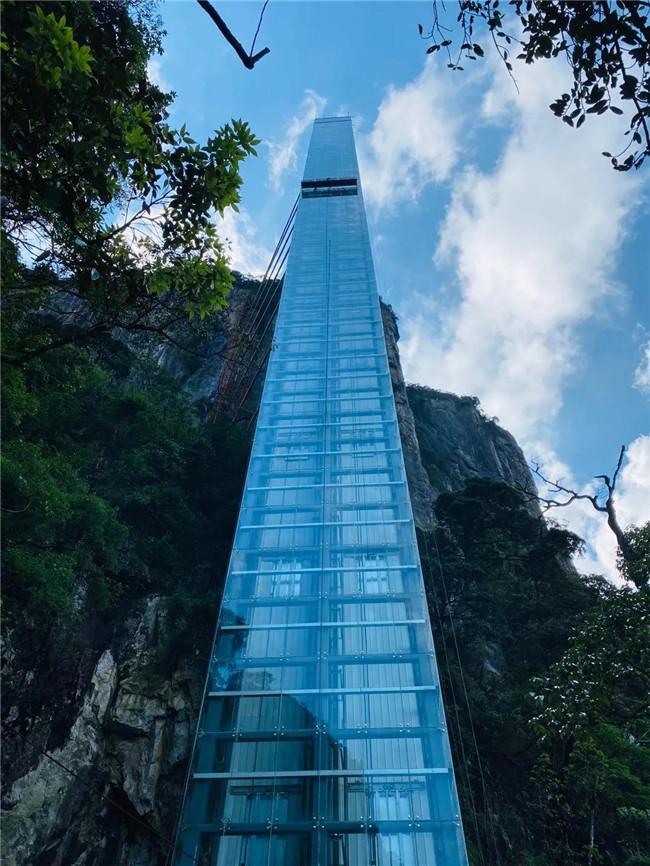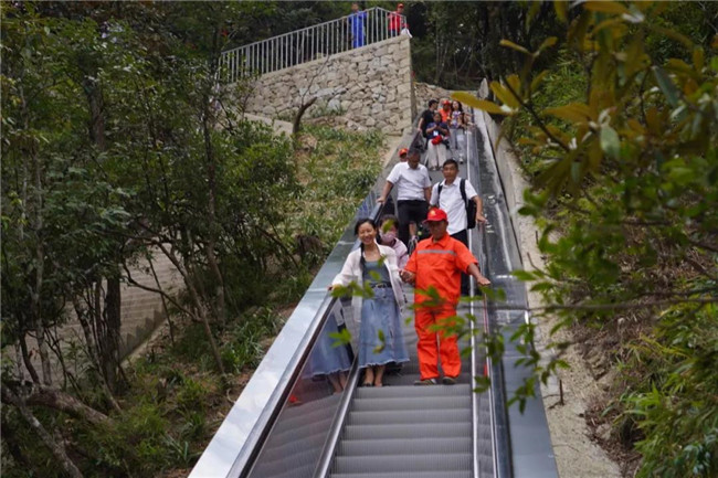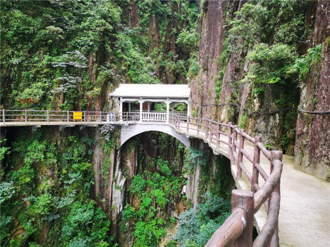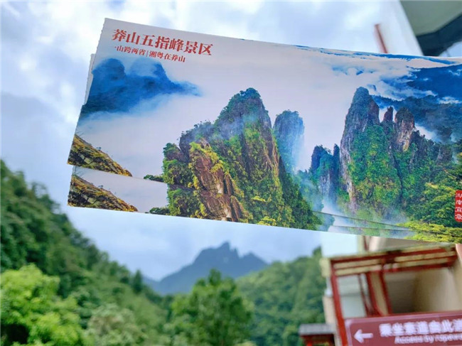 東進東出:索道五指峰站→乘坐索道→索道天臺寺站→棧道中線→峽谷餐廳→摩天嶺電梯→棧道上線→小天臺→天臺寺→天臺小徑→棧道中線→索道天臺寺站→乘坐索道→索道五指峰站