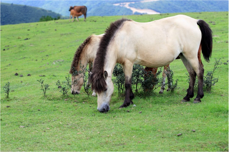 湖四周是茂盛的次原始森林,像一道天然屏障將牧場圍成一個世外桃源。每年春耕過后,村民便把牛馬羊放至仰天湖,任其自由自在無拘無束地生活幾個月,待入冬欲下雪時再去找回來。有時,放出去的是兩頭牛,找回來時卻成了三頭,原來牛夫婦已有了愛的結(jié)晶。這種特殊的放牧方式被當(dāng)?shù)厝嗽娨獾亟谐?ldquo;漂流”。