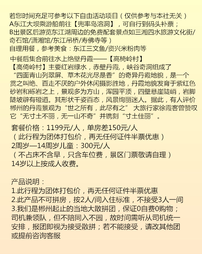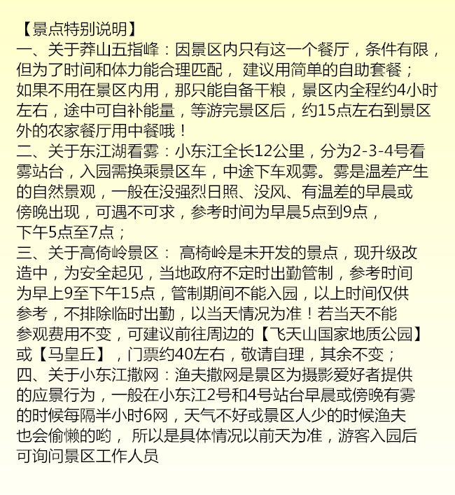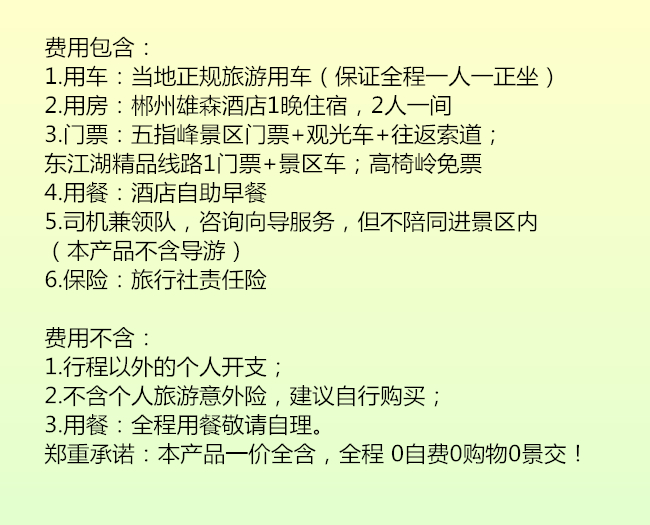 DAY1:郴州市區(qū)接團一莽山·五指峰景區(qū)一入住郴州雄森酒店8點左右郴州市區(qū)(具體時間地點以出發(fā)前一天工作人員通知為準(zhǔn))接貴客前往【莽山·五指峰景區(qū)】,由中景信集團的歷數(shù)三年,巨資投入、超前規(guī)劃、人性設(shè)計、精工建設(shè)及匠心打造,南中國最長懸空棧道:總長約8公里,海拔1400米至1600米,兩層棧道,全程無障礙觀光環(huán)線,登高山、臨絕壁如履平地,盡享“非人”奇遇。乘坐中國目前最長索道單線的觀光纜車;游玩時間約5小時。中餐晚餐自理,晚上入住郴州雄森國際假日酒店。第二天:霧漫小東江一龍景峽谷一高椅嶺--郴州送團早上6點半左右酒店接團前往【霧漫小東江】,偉大的思想家孔子曾經(jīng)說過“仁者樂山,智者樂水”而東江湖正是有山有水它集江南名山秀水的旖旎風(fēng)光于一體,自然景觀與人文景觀交相輝映。景區(qū)面積200平方公里,160平方公里的湖面煙波浩淼平均水深51米,最深處達(dá)157米,蓄水量達(dá)81.2億立方米的湖水 晶瑩透澈,被譽為“湘南洞庭”,數(shù)十個島嶼星羅 其中,被稱為“東方瑞士“溫馨提示:霧漫小東江屬于溫差產(chǎn)生的自然景觀,可遇不可求哦!景區(qū)有安排漁夫撒網(wǎng)表演哦。觀霧后沿小東江觀霧棧道往上游走到3號或者4號站臺,繼續(xù)乘坐景區(qū)環(huán)保車前往終點站一東江大壩旅游碼頭。抵達(dá)大壩后可前往【龍景峽谷瀑布群】(參考時間約1.5小時)龍景峽谷全線游程2.5公里。看山最山勢陡峭,青山滴翠,古木參天;觀水景,一條清澈的溪流在峽谷中穿行,瀑布成群。沿途可以觀賞到煙竹山瀑布、龍景瀑、龍吟瀑、三疊瀑、龍卷瀑、鴛鴦瀑等形態(tài)各異的瀑布和古松坳、連理樹、龍鱗石等千姿百態(tài)的景點。